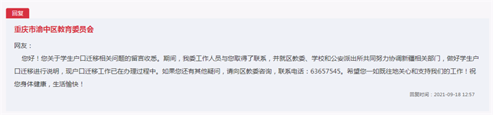 9月18日,渝中區(qū)教委在給李女士留言回復(fù)中稱:您好!您關(guān)于學(xué)生戶口遷移相關(guān)問(wèn)題的留言收悉。期間,我委工作人員與您取得了聯(lián)系,并就區(qū)教委、學(xué)校和公安派出所共同努力協(xié)調(diào)新疆相關(guān)部門,做好學(xué)生戶口遷移進(jìn)行說(shuō)明,現(xiàn)戶口遷移工作已在辦理過(guò)程中。希望您一如既往地關(guān)心和支持我們的工作!祝您身體健康,生活愉快!