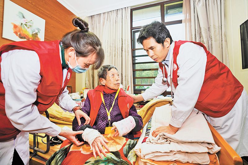 10月15日,在九龍坡區(qū)宏善公園里怡養(yǎng)中心,“三心”勞模志愿服務隊“匠心”分隊隊員為老人繆明媛(中)提供體檢服務。