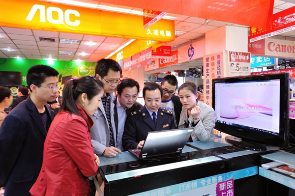 萬州區(qū)稅務(wù)人員走進(jìn)電腦城,向商戶講解電子稅務(wù)局操作。程全攝