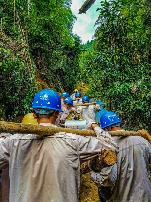 國網(wǎng)重慶豐都供電公司電力員工肩挑背扛在山間小道上搬運變壓器。劉遠平攝