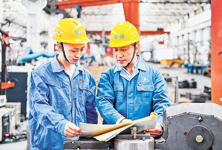 二○二一年十月十五日,重慶大江工業(yè)集團(tuán),師父鄭曉明(右)和徒弟喻亞成(左)正在討論工作。記者 齊嵐森 攝\視覺(jué)重慶
