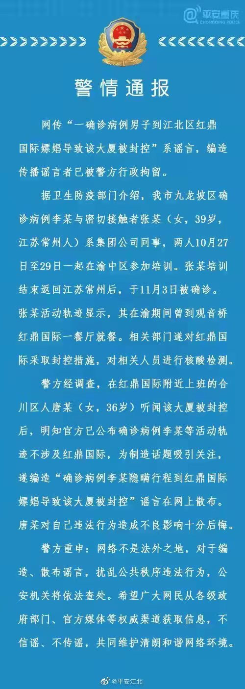 人民網(wǎng)重慶11月5日電 (劉政寧)5日,重慶市公安局江北區(qū)分局發(fā)布警情通報(bào):網(wǎng)傳“一確診病例男子到江北區(qū)紅鼎國(guó)際嫖娼導(dǎo)致該大廈被封控”系謠言,編造傳播謠言者已被警方行政拘留。