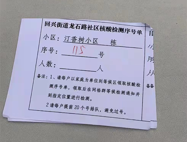 “為了避免等待時(shí)人員聚集,減少群眾等待時(shí)間,我們想出了給每個(gè)家庭發(fā)放序號單的方法。”回興街道駐龍石路社區(qū)干部崔燕介紹,她所在的愛地社區(qū)羽毛球場采樣點(diǎn),是龍石路社區(qū)采樣點(diǎn)的其中一個(gè)。
