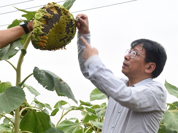 易志堅查看沙漠土壤化種植出來的向日葵。重慶交通大學供圖