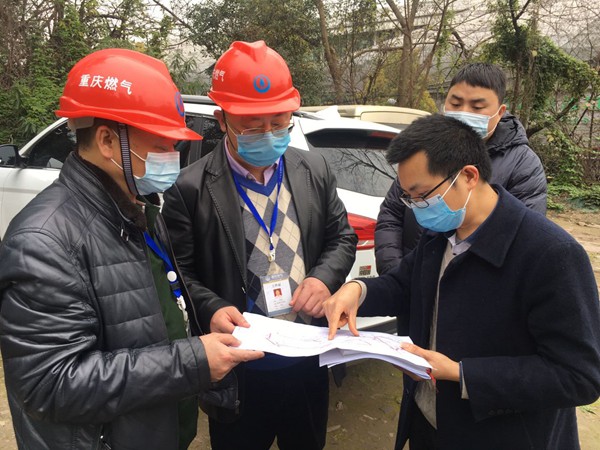 重慶燃氣管道維護分公司和施工方確認(rèn)遷改流程。重慶燃氣集團供圖