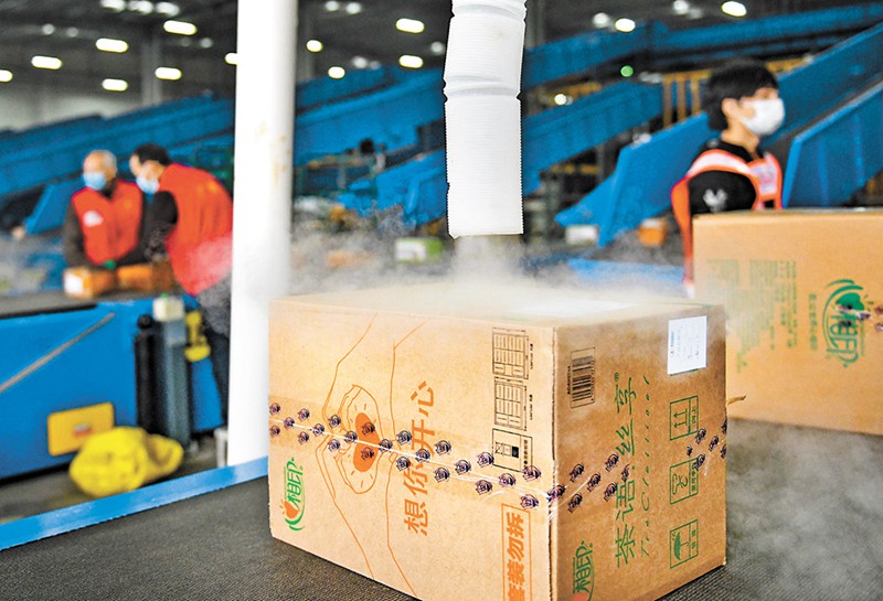 11月13日,在中郵重慶市分公司空港郵件處理中心,入口處的管道噴霧式消殺器在垛口自動對包裹進(jìn)行消毒。