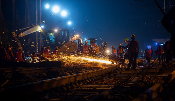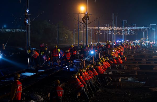 人民網(wǎng)重慶11月15日電 11月14日凌晨2點,由中鐵十一局集團承建的萬州北站改造工程現(xiàn)場燈火通明,300多鐵路工人齊心協(xié)力,用劃龍舟的方式,將最后一組道岔推到指定位置。