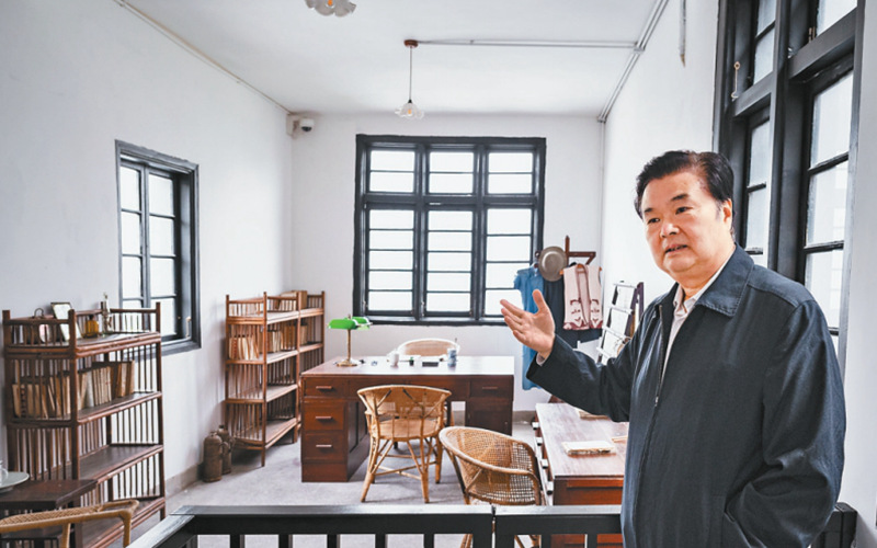 在周恩來與鄧穎超辦公室兼臥室的原樣復(fù)原房間前,周勇正在介紹相關(guān)的故事。記者 張春曉 攝\視覺重慶