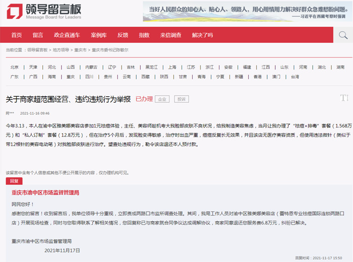 “今年3月,本人在渝中區(qū)雅美娜美容店參加1元祛痘體驗(yàn),該店主任、美容師趁機(jī)夸大我臉部皮膚不良狀況,給我制造‘美容焦慮’,讓我當(dāng)月辦理了‘祛痘+排毒’套餐(1.568萬元)和‘私人訂制’套餐(12.8萬元)!11月16日,該網(wǎng)友在人民網(wǎng)“領(lǐng)導(dǎo)留言板”留言稱,她在治療5個(gè)月后,發(fā)現(xiàn)臉變得敏感,治療時(shí)出血嚴(yán)重,痘痘反復(fù)長無效果。希望相關(guān)部門進(jìn)行查處,并退還其費(fèi)用。