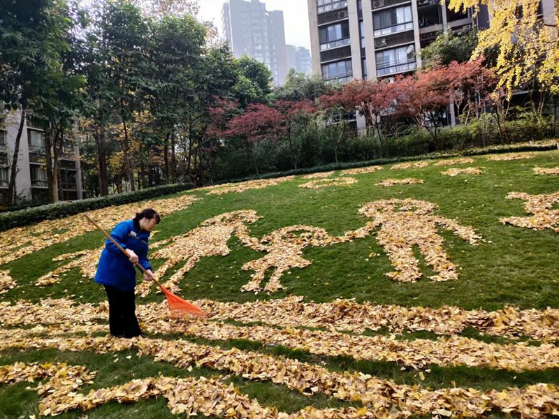11月,又是一年杏葉黃的季節(jié),在不少社區(qū),落葉保潔是令物業(yè)頭疼的難題之一,“嘩嘩嘩”的笤帚聲,往往會(huì)是它們最終的歸宿。但在重慶龍湖水晶酈城的園區(qū),卻有這么一群人,他們雖不是畫家,但熱衷以秋葉“作畫”,擺出各種創(chuàng)意圖案,成為社區(qū)業(yè)主們爭(zhēng)相拍照、曬社交網(wǎng)絡(luò)的打卡點(diǎn),讓落葉在生命盡頭,為美好生活綻放最后的光輝。而這一葉、一畫,轉(zhuǎn)眼便已成了堅(jiān)持了6年的傳統(tǒng)。