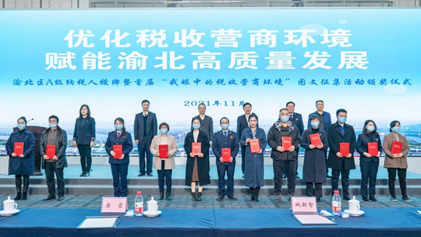 活動(dòng)現(xiàn)場(chǎng)為渝北區(qū)首屆“我眼中的稅收營(yíng)商環(huán)境”圖文征集活動(dòng)獲獎(jiǎng)代表頒獎(jiǎng)。 郭睿攝