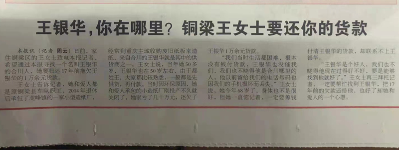 她登報(bào)尋人,只為還17年前欠的1萬元