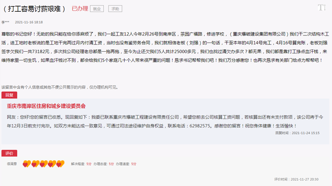 重慶市南岸區(qū)住房和城鄉(xiāng)建設(shè)委員回復(fù):我委已聯(lián)系重慶市爆破工程建設(shè)有限責(zé)任公司,希望您前去公司核算工資問題,若核算出還有未支付款項,該公司將于今年12月3日前支付完畢。如雙方未能達成一致意見,可通過司法途徑維護自身權(quán)益。感謝您的留言,助您身體健康,生活愉快!