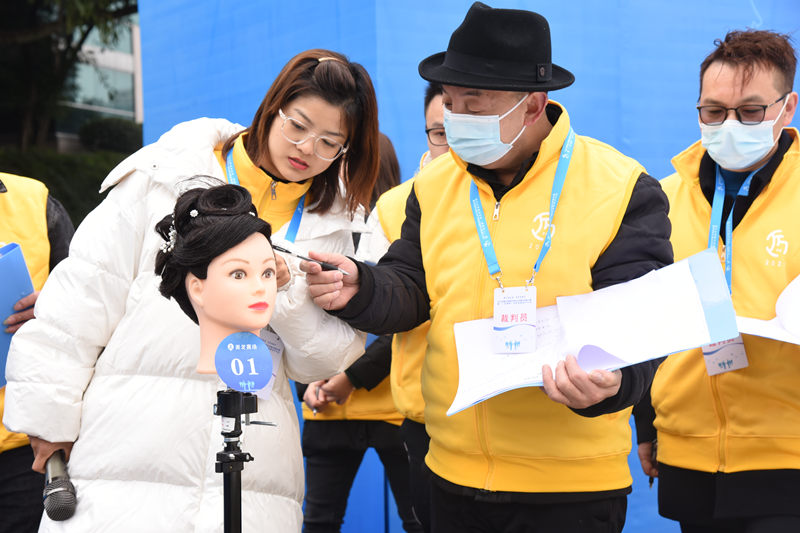 美發(fā)賽場裁判員為作品打分?;顒又鬓k方供圖