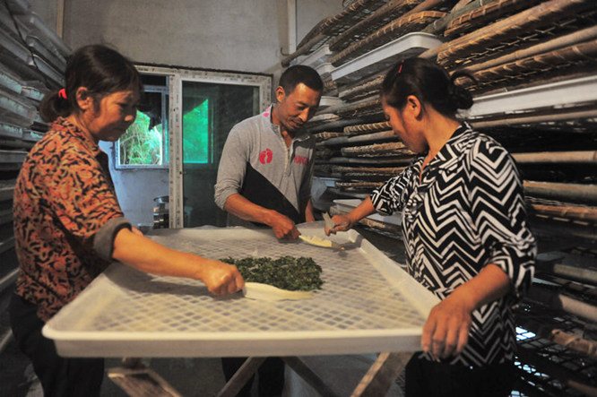 養(yǎng)蠶時(shí)節(jié),周適合與村民康鳳華和粟正瓊一道,在供育室里正在給才出生的“蠶寶寶”換桑葉。龔杰品攝