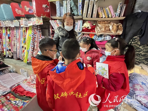 人民網(wǎng)重慶12月15日電 (胡虹)“阿姨,這是垃圾分類宣傳手冊(cè),您看一下!苯,重慶市沙坪壩區(qū)雙碑街道雙碑街社區(qū)開展“大手拉小手”垃圾分類宣傳活動(dòng),來(lái)自嘉陵實(shí)驗(yàn)小學(xué)和嘉陵小學(xué)的小朋友,利用課余時(shí)間走進(jìn)商圈,為商戶宣傳垃圾分類知識(shí)。