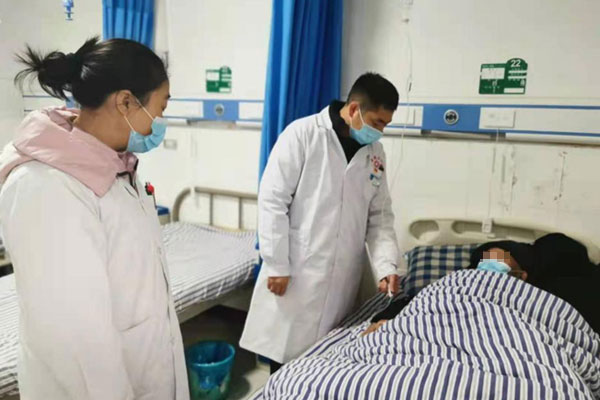 譚波(右)和院內(nèi)醫(yī)生到病房探望患者、與患者交流。暨龍鎮(zhèn)衛(wèi)生院供圖