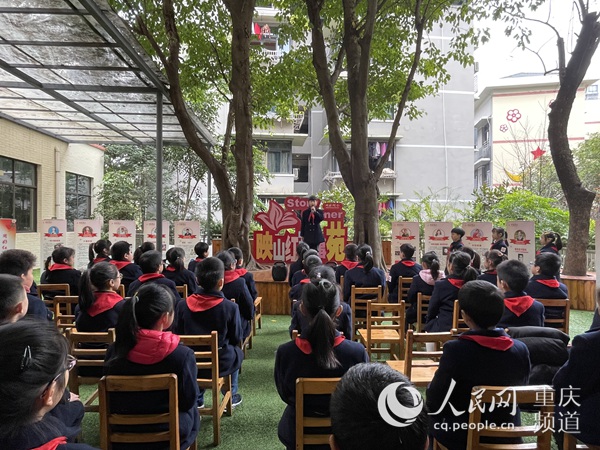 - “紅巖小導(dǎo)游”在重慶市沙坪壩區(qū)四川外國(guó)語大學(xué)附屬小學(xué)映山紅故事苑講紅色故事。人民網(wǎng) 胡虹攝 “紅巖小導(dǎo)游”介紹校園文化!