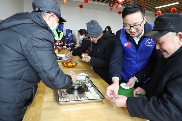 老人和志愿者們一起包餃子。中建八局西南公司供圖