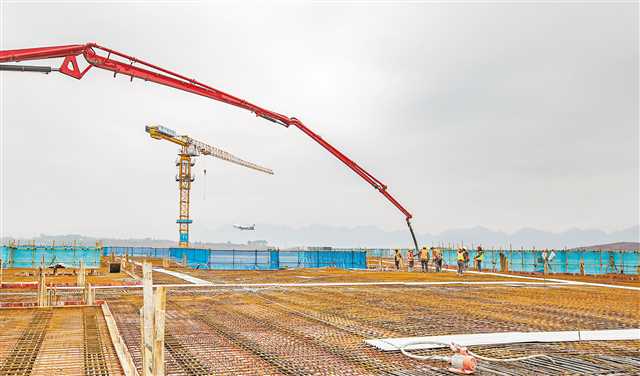 十二月二十七日,在重慶江北國際機場T3B航站樓項目施工現(xiàn)場,施工人員在進(jìn)行指廊主體結(jié)構(gòu)封頂澆筑。新華社記者 黃偉 攝