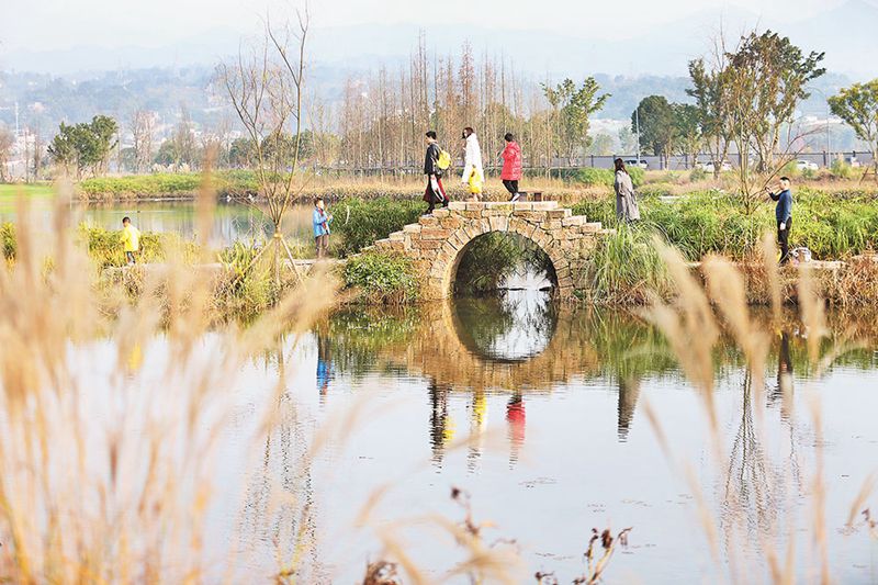1月1日,廣陽島,游人行走在充滿江南風(fēng)韻的小石橋上。廣陽島充滿詩情畫意的山水田園風(fēng)景,吸引越來越多的市民到此游玩,享受生態(tài)環(huán)境建設(shè)帶來的美好生活。特約攝影 鐘志兵/視覺重慶