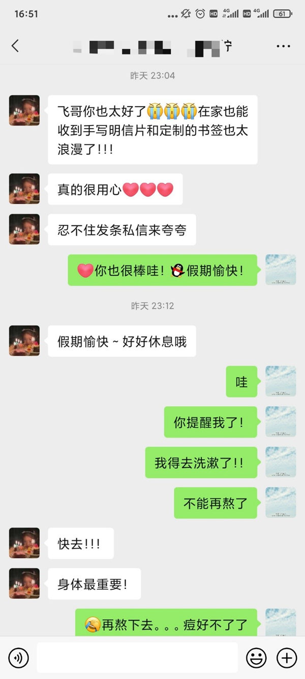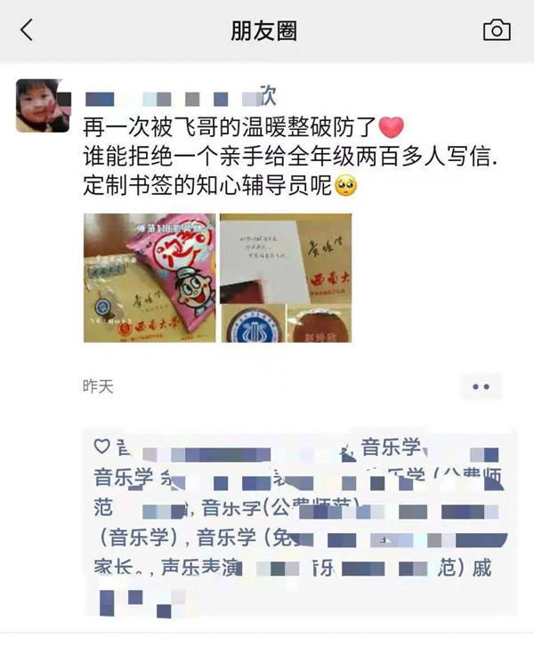 “不止是期末給我們每個(gè)人一封專屬信,飛哥一直都很暖。“西南大學(xué)音樂(lè)學(xué)院2021級(jí)崔同學(xué)稱,飛哥很有心,他入學(xué)報(bào)到第一天,飛哥來(lái)寢室,居然喊出了他的名字。