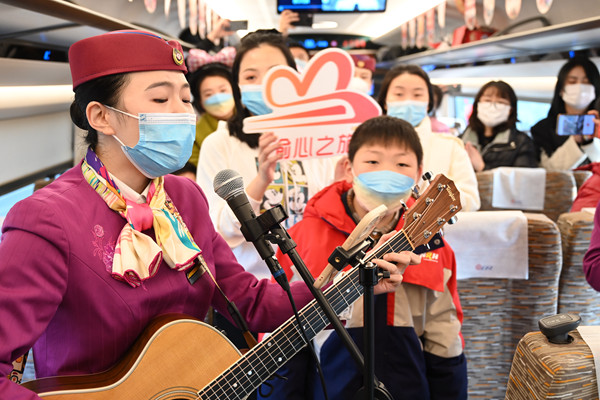 “復(fù)興號(hào)”的乘務(wù)員與旅客一起吉他彈唱。包亮攝