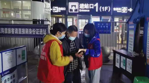 “站小青”志愿者在綦江東站協(xié)助查驗(yàn)往返旅客健康碼。共青團(tuán)綦江區(qū)委供圖