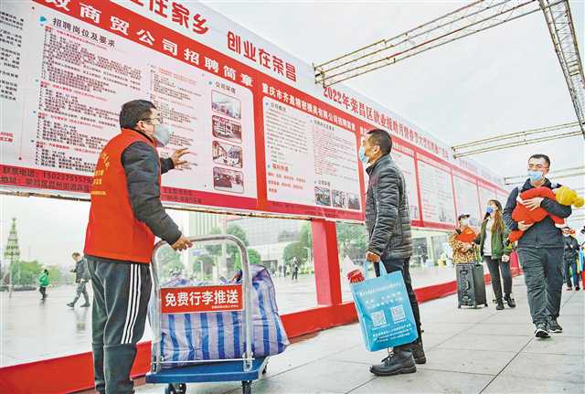 1月25日,榮昌北站高鐵站“就業(yè)長廊”,提供行李推送服務(wù)的志愿者(左一)正在為返鄉(xiāng)務(wù)工人員(左二)介紹招工企業(yè)信息。