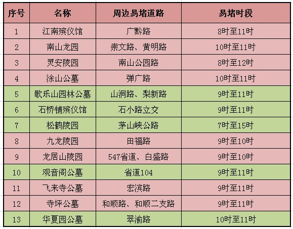 初一至初四為群眾祭祀掃墓高峰期,春節(jié)期間,預(yù)計(jì)中心城區(qū)各大公墓(陵園)將迎來集中祭掃高峰,屆時(shí)南岸區(qū)江南殯儀館、 南山龍園公墓、靈安陵園、涂山公墓,沙坪壩區(qū)歌樂山園林公墓、石橋鋪殯儀館、松鶴陵園,九龍坡區(qū)九龍陵園、龍居山陵園,巴南區(qū)觀音閣公墓,江北區(qū)寺坪陵園、飛來寺公墓,兩江新區(qū)華夏園周邊道路易出現(xiàn)短時(shí)交通擁堵,易堵路段和時(shí)段詳見下表: