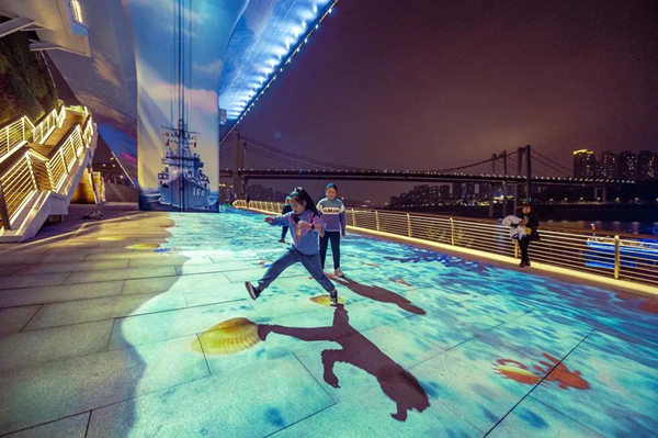 在重慶建川海疆博物館景區(qū)內(nèi),15臺激光投影儀將一條兩百多米長的沙灘投射在了地面:海浪不時拍打在沙灘上,不少魚、蝦、螃蟹正在水里游動,非常逼真。同時,為了增添景區(qū)夜間的觀賞性,制作方還采用了雷達技術,讓游客得到沉浸式的互動體驗:當人在沙灘上來回散步時,腳下會出現(xiàn)一朵朵浪花,仿佛讓人身臨其境。