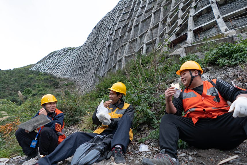 不知不覺已上山3個(gè)多小時(shí),還有一半的山體要排危,大家的午餐就只能在“絕壁”解決。他們休息的地方恰好是渝懷鐵路白馬1號(hào)隧道正上方。大家各自啃著干糧,喝著礦泉水,討論著春運(yùn)期間每天要從這里通過的旅客列車!八焉綊呶P量嗍切量嗔它c(diǎn),但是每次看著列車安全通過,我們心里還是挺欣慰的。”方劍說話間正好一輛復(fù)興號(hào)“綠巨人”從山下呼嘯而過。