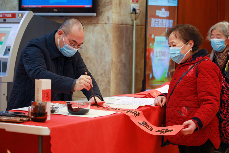 在中信銀行重慶沙坪壩支行,一副副洋溢著喜慶、散發(fā)著墨香的手寫(xiě)春聯(lián)和福字將廳堂裝扮得紅紅火火,喜氣洋洋。