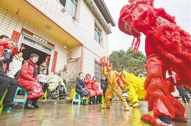 江津區(qū)先鋒鎮(zhèn)保坪村,文藝小分隊(duì)在農(nóng)家院壩表演舞獅。