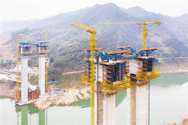 二月十日,渝武高速擴能項目控制性工程觀音峽嘉陵江特大橋施工忙。特約攝影 秦廷富\視覺重慶