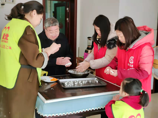 在玉峰山鎮(zhèn)石坪社區(qū),老人們圍坐一堂,志愿者們拿出提前準備好的糯米面粉、湯圓餡,讓老人們親自動手包湯圓。在揉面、拌餡、搓湯圓的過程中家長里短、你說我笑,氣氛熱烈。不一會兒,象征團圓的湯圓端上桌,老人和志愿者們開心地品嘗著自己制作的湯圓。志愿者隨后還將煮好的湯圓送到了腿腳不便的94歲老人段前民家中,吃著湯圓,老人開心地笑了。