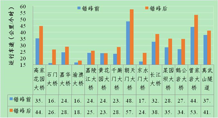 錯(cuò)峰橋隧高峰時(shí)段平均運(yùn)行車速對比表