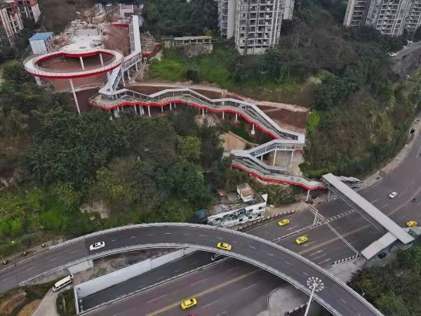 人民網(wǎng)2月21日電 紅色步道沿著山體蜿蜒而下,步道內(nèi)還有圓形的觀景平臺(tái)。近日,隨著南岸區(qū)蘇家壩步道觀景平臺(tái)主體工程全部完工,這個(gè)便捷又美麗的新景觀,未通先火了起來,目前工人正加緊綠化和裝飾收尾工作。