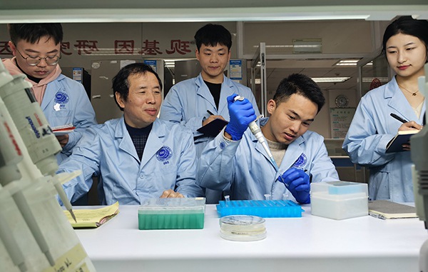 西南大學(xué)前沿交叉學(xué)科研究院生物學(xué)中心主任夏慶友教授指導(dǎo)學(xué)生做實(shí)驗(yàn)。袁杰攝
