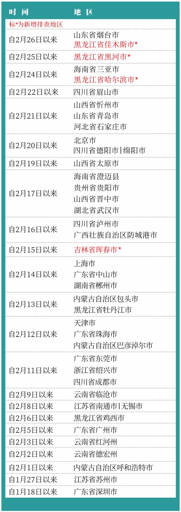 3月1日新增:佳木斯市、黑河市、哈爾濱市、琿春市