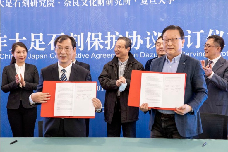 人民網(wǎng)重慶3月2日電 為全面提升大足石刻保護(hù)基礎(chǔ)與理論研究水平,推進(jìn)石窟寺科技保護(hù)及預(yù)防性保護(hù)工作,3月1日,大足石刻研究院、復(fù)旦大學(xué)、日本奈良文化財研究所通過在線視頻方式分別在重慶市大足區(qū)和日本奈良市舉行中日合作大足石刻保護(hù)協(xié)議簽訂儀式。