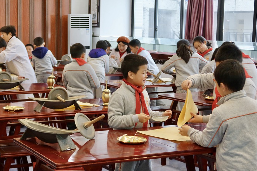 縱橫交錯的棋盤,在對弈中演繹無窮變化,啟迪孩子的智慧;書法館里,書法老師細致講解執(zhí)筆方法和運筆要領(lǐng);四大發(fā)明體驗館中,同學(xué)們可以親身參與排版、勻墨、上墨、拓印、揭紙等流程,感受活字印刷的魅力;中醫(yī)藥館中,醫(yī)者則化身師者,帶領(lǐng)學(xué)生走進歷史久遠的中醫(yī)藥文化。