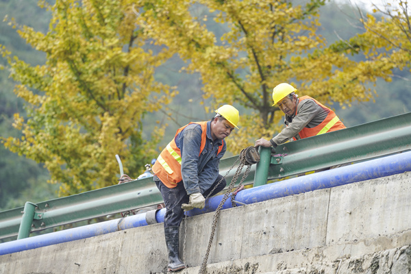 2021年10月29日在重慶市北碚區(qū)天府鎮(zhèn)中心村,重慶碚江水務(wù)的施工人員在安裝供水管道。秦廷富攝