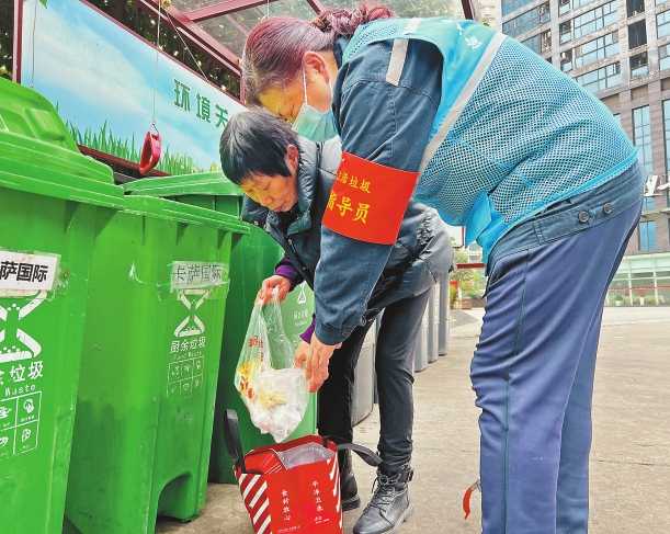 “公共衛(wèi)生代言人”王元會(huì)正在幫助居民正確分類垃圾。記者 梅耀 攝