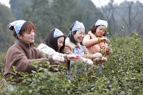 中鐵八局一公司女職工采摘春茶。中鐵八局一公司供圖