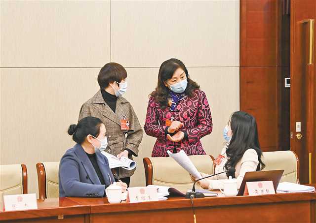 3月7日上午,重慶代表團(tuán)小組會(huì)議結(jié)束后,李紹玉代表、石淑蘭代表、李秋代表、吳彥?代表(從左到右)就提升基層?jì)D女兒童醫(yī)療能力的話題進(jìn)行討論。記者 蘇思 攝/視覺重慶