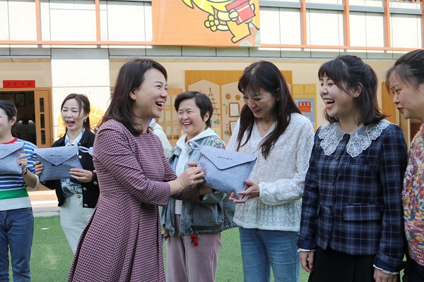園長(zhǎng)為老師贈(zèng)送禮物。新村幼兒園供圖