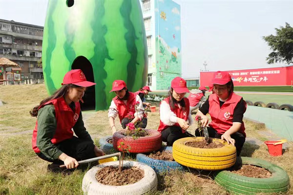 在永川區(qū)五間鎮(zhèn)的五間幼兒園,該園黨支部組織全體黨員教師開展“為校園添綠,為黨旗添彩”主題黨日活動,黨員教師用激情和汗水揮锨鏟土、栽種樹苗、播種花種、圍坑澆水,以實際行動為師生營造一個美麗的校園環(huán)境;