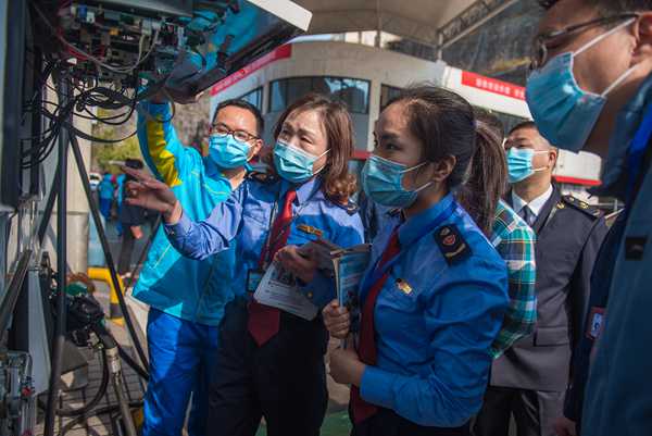 市場監(jiān)管局工作人員查看加油機(jī)。侯本艷攝
