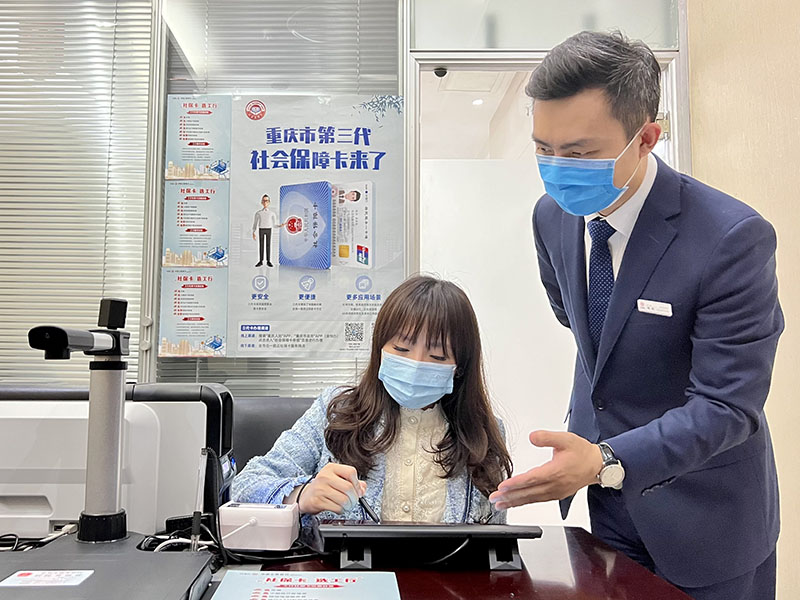 工作人員指導客戶辦理第三代社???。工行重慶市分行供圖